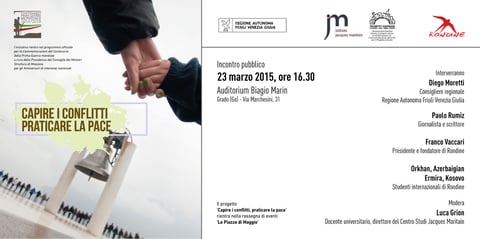 In occasione del Centenario della Grande Guerra l’associazione Rondine Cittadella della Pace, in collaborazione con l'Istituto Jacques Maritain, presenta il progetto “Capire i conflitti – Praticare la pace”. L’iniziativa, che rientra nel programma ufficiale per le Commemorazioni del Centenario della Prima Guerra mondiale a cura della Presidenza del Consiglio dei Ministri - Struttura di Missione per gli Anniversari di interesse nazionale e realizzata con il patrocinio della Regione Friuli Venezia Giulia, si terrà lunedì 23 marzo alle ore 16.30 presso l’Auditorium Biagio Marin a Grado (GO), alla presenza del consigliere della Regione, Diego Moretti. Dopo la presentazione del progetto da parte del presidente dell’associazione Rondine Cittadella della Pace, Franco Vaccari e dei giovani dello Studentato Internazionale, interverrà il giornalista e scrittore Paolo Rumiz, sul tema della memoria storica del primo conflitto mondiale. L’incontro sarà moderato da Luca Grion, docente universitario e presidente dell’Istituto Jacques Maritain. L’evento rientra inoltre nella rassegna “Piazze di Maggio” realizzata da Rondine fin dal 2006 in collaborazione con il Servizio Nazionale per il Progetto Culturale della CEI.